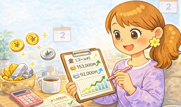 金・プラチナ 金銀プラチナが暴落中?私の評価額をチェックしてみた こんにちは!うさこです。なんだか金(ゴールド)市場が荒れているそうですね!2月に入ったので早速評価額をチェックしてみましょう(/・ω・)/前回は12月でした。金(ゴールド)の価格推移前回から約1か月しか経っていないので、1か月推移でみてみま... 2026.02.02 金・プラチナ