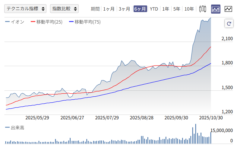 海外リスクが高まるなか、生活必需品を扱う内需株が見直されています。イオンは日常消費に直結する企業として安定感があり、資金が集まりやすい状況です。