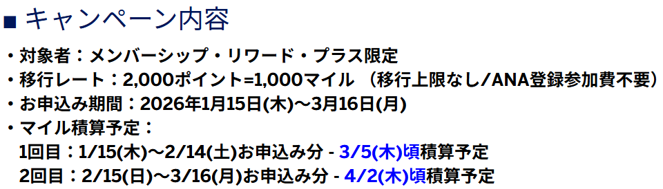 こちらのキャンペーンはマイル移行期間が少々長いようですが、