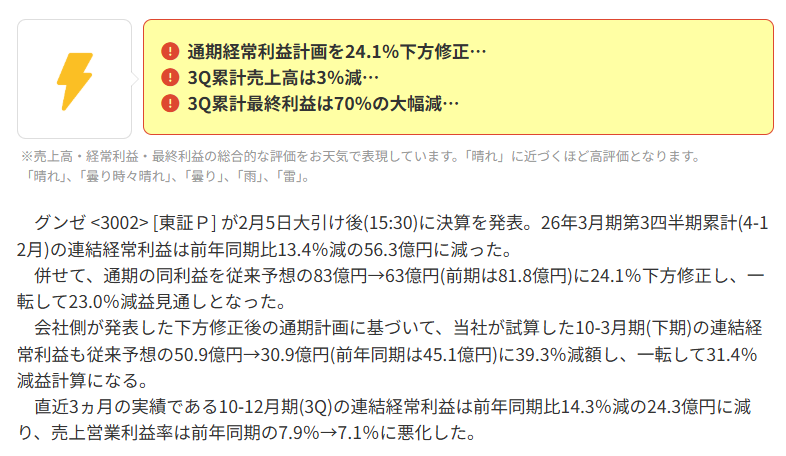 先日、3月の権利落ちでグンゼ(3002)を買いました。