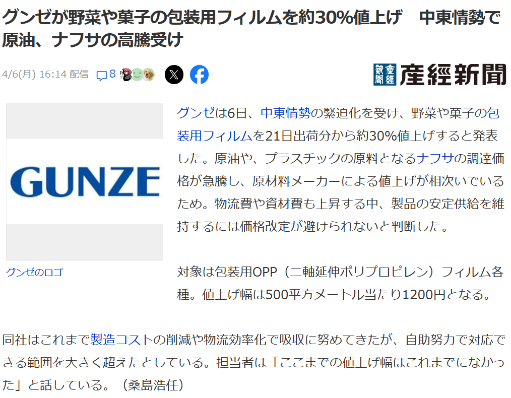 と思っていたところ、しっかり価格転嫁のニュースが出ていました。