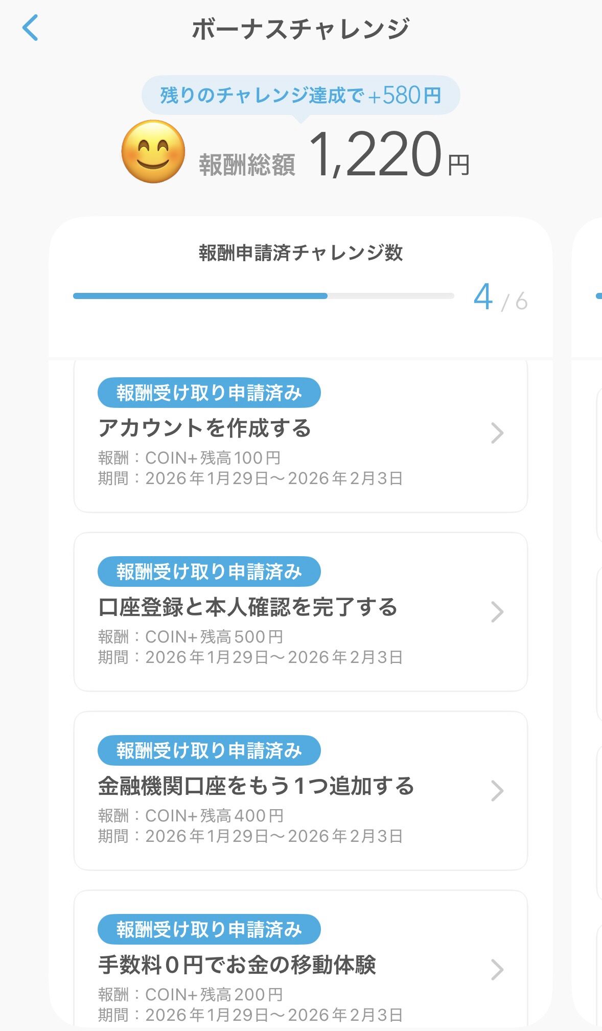 さらに、これは常時やっている?キャンペーンなのかわかりませんが、ボーナスチャレンジをクリアしていくと報酬が受け取れます。