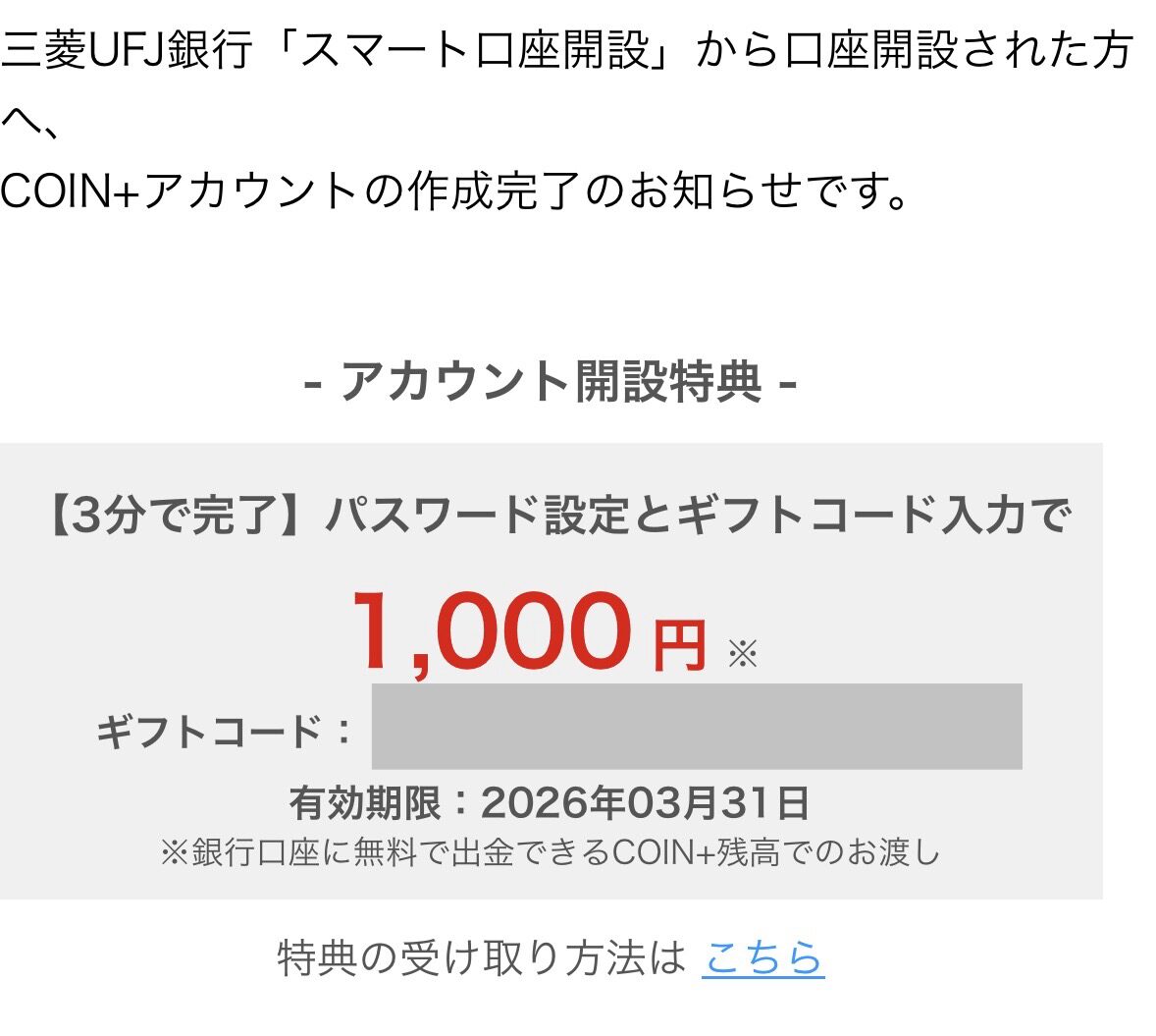 三菱UFJ銀行のキャンペーンに従ってCOIN+を開設したあとにメールで作成完了のお知らせが届き、これをチェックしたところ1,000円分のギフトコードが貰えました!