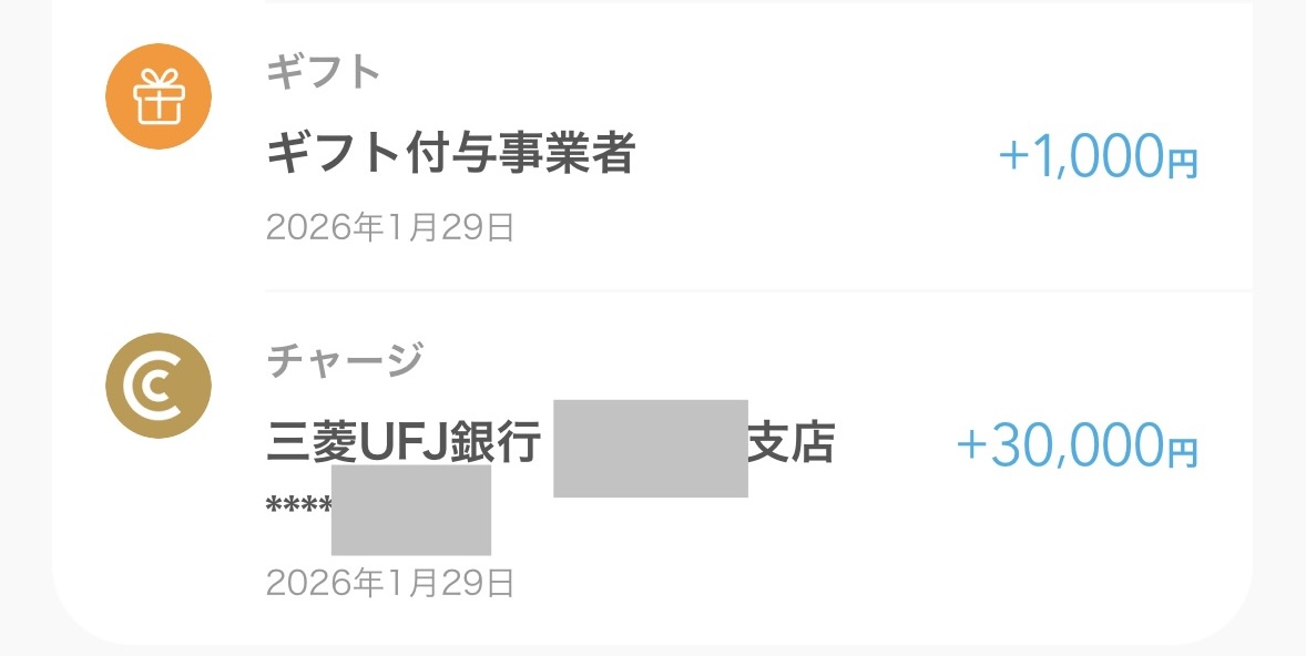 三菱UFJ銀行の口座からCOIN+へ初回残高チャージで金額に応じたプレゼントが貰えます。