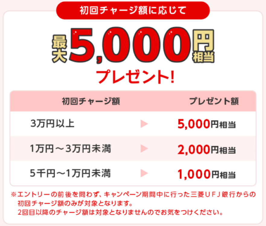 これはチャージ額が15,000円以上なので、三菱UFJ銀行のキャンペーンと併用できます。