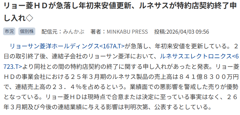 理由はルネサス特約店契約終了を申し入れている、ということ。